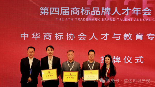 2025年11月21日,中华商标协会发布了“关于调整中华商标协会人才与教育专业委员会成员的通知”,安徽省信达商标事务有限责任公司成为安徽省唯一入选“中华商标协会人才与教育专业委员会委员单位”的代理机构。11月28日,第四届商标品牌人才年会在北京召开,信达商标董事长朱洪涛受邀参加会议,并接受授牌。